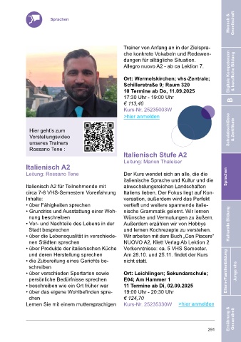 € 181,50 (Anmeldung ab 01.12.2025 möglich) Italienisch A2 für Teilnehmende mit italienische Sprache und Kultur und die